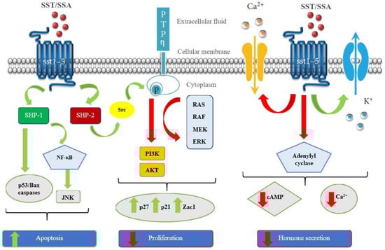 Schematic representation of the signaling pathways induced by somatostatin receptors activation. Green arrows: activated pathways; red arrows: inhibited pathways. Adapted from [8].