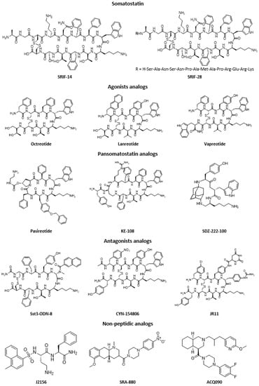 Somatostatin has a short half-life in the body (between one and three minutes), because it is rapidly degraded by peptidases found in plasma and tissues [40]. Therefore, the amount present in the bloodstream is extremely low (between 14 and 32.5 pg/mL). This very short half-life has been considered a limiting factor for possible clinical applications, thus many analogs with better metabolic properties (longer half-life between 1.5 h and 12 h) have been rapidly developed [2,5,9]. These are most often hexapeptide or octapeptide molecules which incorporate the biologically active core of native somatostatin (see some examples in Figure 3). Indeed, studies on the structure–activity correlation have shown that the Phe7, Trp8, Lys9, and Thr10 sequence in the form of a β-sheet is necessary for biological activity. The residues Trp8 and Lys9 are essential for this activity, whereas Phe7 and Thr10 may undergo some substitutions. Among somatostatin analogs, there are two main categories: the agonists (substances capable of activating somatostatin receptors) and the antagonists (molecules that interact with somatostatin receptors and block or reduce the physiological effect of an agonist). It is also important to note that somatostatin analogs have different affinities for the different receptor subtypes [2].