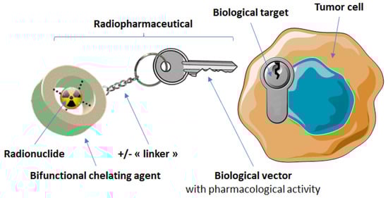 In the field of medicine, much research is focused on finding methods to achieve earlier detection of pathologies to allow treatment at early stages of the disease, to increase the chances of total recovery. For this purpose, nuclear medicine, through the use of radiopharmaceuticals, is a very powerful tool. Its application can have two different aims: imaging, with the visualization of a radioactive element’s distribution in the body, or therapy, with specific irradiation of abnormal cells, thereby reducing damages to nearby healthy tissue. Having a broad range of potential biological targets and desirable pharmacokinetic characteristics—such as high uptake in target tissue and fast blood and non-target tissue clearance—peptides can also be easily chemically modified for incorporation into a radiopharmaceutical, making them a very potent targeting vector for nuclear medicine. Research in that domain has thus gained widespread interest [46,47,48,49]. These compounds can be directly labeled with a radionuclide, such as a halogen radioisotope, but they are generally based on a triple structure involving: (i) a radiometal, the radiation of which allows either the localization (γ and β+ emitters) or the destruction (β−, α or Auger electron emitters) of the targeted cells; (ii) a bifunctional chelating agent (BFCA), the dual role of which is not only to bind the radiometal in a very stable manner to minimize its dissociation in vivo, but also to allow its conjugation with targeting moiety (or vector) via a functionalized arm; (iii) a targeting moiety (the peptide analog), which aims to convey this set in a specific way to a well-defined target. To limit the influence of the chelating moiety, a linker (or spacer) is usually inserted between the BFCA and the biomolecule (Figure 4).