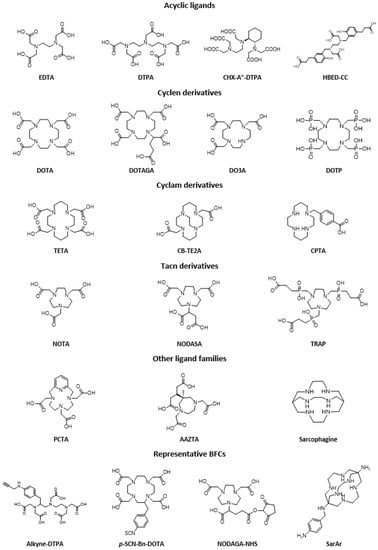 Chelating ligands used for the design of radiotracers are usually classified into two categories: macrocyclic and acyclic compounds (Figure 5). Generally, acyclic ligands are less kinetically inert than macrocycles, although some may have shown very good characteristics. On the other hand, these ligands generally have faster metal-chelate binding kinetics compared to macrocyclic analogs, which represents a huge advantage for working with isotopes that have a short lifespan. Despite the coordination properties specific to each metal, some chelating agents—such as polyaminopolycarboxylic acids—are considered to be ‘universal’ because they can complex different radiometals.