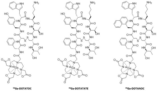 These three systems, similarly labeled with gallium-68 (Figure 7), have proven to be very good radiotracers, and are currently routinely used in clinical applications [75]. These three radiopharmaceuticals have slightly different pharmacokinetic properties, but their diversity is mainly due to the variation in affinity for certain subtypes. This feature is even more marked depending on the radioelement chosen (68Ga or 111In). This can be explained by the differences in the geometry of the complexes. [68Ga]-DOTATOC is very affine for SSTR2 and more moderate for SSTR5, [68Ga]-DOTATATE is specific to SSTR2 and finally, [68Ga]-DOTANOC binds with great affinity to SSTR2, SSTR3, and SSTR5 [76,77,78].