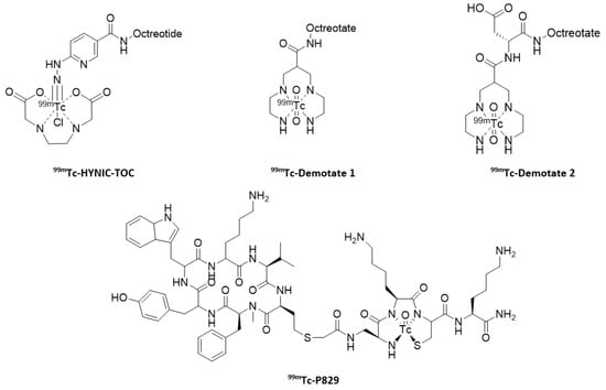 A wide range of chelating agents have been used to prepare somatostatin analogs labeled with technetium-99m: peptide moieties [90,91], propyleneaminooxime [92], tetraamines [93,94] or a cyclopentadienyl group [95]. Macrocyclic ligands have also been investigated [96]. Three systems stand out for the radiolabeling of somatostatin analogs: HYNIC-TOC and Demotate scaffolds, and P829 (Figure 8).