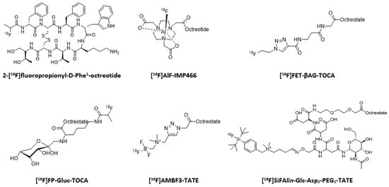 - Allott, L.; Dubash, S.; Aboagye, E.O. [18F]FET-βAG-TOCA: The Design, Evaluation and Clinical Translation of a Fluorinated Octreotide. Cancers 2020, 12, 865. [Google Scholar] [CrossRef] [PubMed]