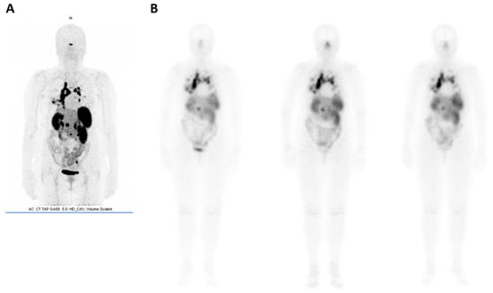 The same analogs have also been radiolabeled with lutetium-177. Initially, [177Lu]-DOTATOC was used in cases of relapse of neuroendocrine tumors after treatment with [90Y]-DOTATOC. Despite satisfactory results [166], its subsequently developed analog [177Lu]-DOTATATE has shown more promise, mainly due to a more significant retention time in the tumor. For this reason, octreotate analog (TATE) is being preferred to octreotide (TOC) for labeling with lutetium [164,167]. It is also important to note that, unlike 90Y, no cases of nephrotoxicity after treatment with 177Lu have been reported. In 2005, the possibility of combining these two β− emitters for therapy in cases where tumors of variable sizes are detected, was demonstrated [168]. From there, different treatment combinations between the four main systems ([90Y]-DOTATOC, [90Y]-DOTATATE, [177Lu]-DOTATOC, and [177Lu]-DOTATATE) have proven to be interesting and sometimes even more effective than using a single treatment modality [169,170]. Similarly, combination treatments with non-labeled somatostatin analogs, chemotherapy, targeted therapy, and/or radiosensitizers might further improve the efficacy and/or tolerability [171,172]. [177Lu]-DOTATATE has been investigated in a phase III trial, in well-differentiated, unresectable or metastatic, progressive midgut neuroendocrine tumors (Netter 1 trial). Treatment with [177Lu]-DOTATATE resulted in a significant tumor response rate of 18% compared with 3% in the high-dose octreotide LAR group, coupled with a 79% risk reduction for disease progression or death [173]. Following these positive findings, [177Lu]-DOTATATE was granted marketing authorization in this indication, both in Europe and in the US (Lutathera®) [174]. Coupled with 68Ga-imaging (Figure 10), it represents a powerful theranostic tool for the management of neuroendocrine tumors (NETs) [175]. Current research with [177Lu]-DOTATATE aims to improve the safety and efficacy of this procedure, enlarge possible indication, notably in advanced, poorly-differentiated, GEP-NETs, [176,177] or other NETs, such as pheomochromocytoma or paraganglioma [178,179].