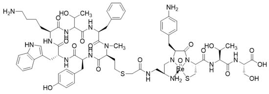 - Cyr, J.E.; Pearson, D.A.; Wilson, D.M.; Nelson, C.A.; Guaraldi, M.; Azure, M.T.; Lister-James, J.; Dinkelborg, L.M.; Dean, R.T. Somatostatin receptor-binding peptides suitable for tumour radiotherapy with Re-188 or Re-186. Chemistry and initial biological studies. J. Med. Chem. 2007, 50, 1354–1364. [Google Scholar] [CrossRef]
