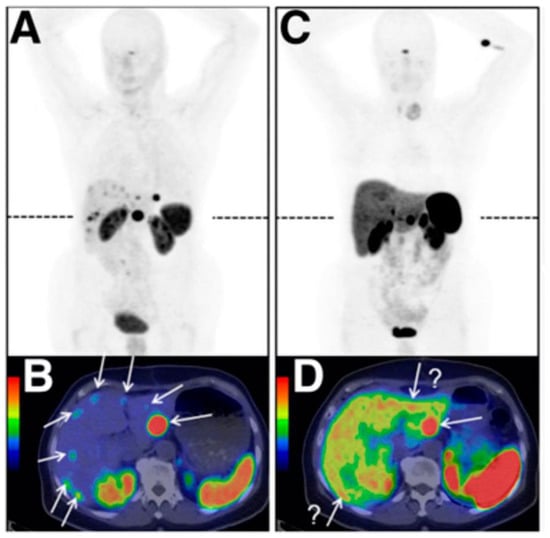 Comparison between [68Ga]-OPS202 (A,B) and [68Ga]-DOTATOC (C,D) PET/CT images of the same patient with ileal neuroendocrine tumours, showing bilobar liver metastases (from Rangger et al. [233]).