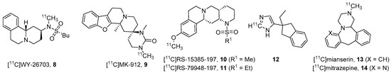 Furthermore, in 2002, Smith’s group developed two tetracyclic based anti-depressant radiotracers, mianserin (13) and mitrazepine (14), that have potent antagonist properties at α2-ARs and also at serotonin receptors (5HT2A, 5HT2C) and labelled them with C-11 to prepare 13 and 14 (Figure 2) [92,93]. The radiotracers 13 and 14 were prepared from their respective N-desmethyl precursors via 11C-methylation with ~40 GBq/μmol and 5–7 GBq/μmol molar activity, respectively. PET studies in female pigs with 13 showed limited binding potential in brain whereas 14 showed more favorable properties including slow metabolism, fast brain uptake and sufficient target-to-background ratio for pharmacokinetic parameters estimation.