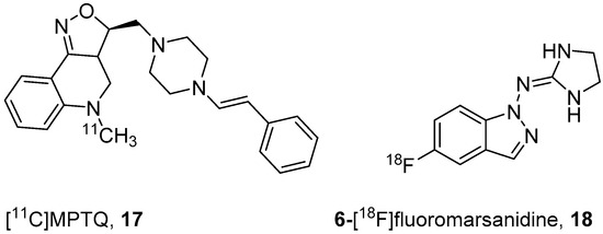 Kumar’s group in 2010 developed [11C]MPTQ (17, Figure 5) for the quantification of α2A-ARs in vivo [35]. Compound 17 was shown to have blocking effects on α2A-ARs in vivo in brain and has stronger affinities for α2A-AR (Ki = 1.6 nM) than α2C-AR (Ki = 4.5 nM) and 5-HTT (serotonin transporter, Ki = 16 nM) [99]. They anticipated no binding of 17 to α2B and α2C-ARs since the densities of these receptors are lower than α2A-ARs. In addition, the 10-fold higher affinity of 17 α2A-ARs over 5-HTT is advantageous for α2A-ARs as both have similar Bmax values. The radiosynthesis of 17 was accomplished through 11C-methylation of its respective N-desmethyl precursor with 74–88.8 GBq/μmol molar activity at the end of synthesis (EOS). PET studies in baboons with 17 showed that it penetrated the BBB and accumulated in α2A-AR-rich brain areas. They ruled out binding of 17 to 5-HTT due to its low uptake in the hippocampus, temporal cortex, and occipital cortex, which are the brain regions with the highest binding of 5-HTT radiotracers. No further studies were reported using 17.