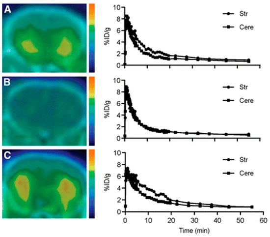 The in vivo PET and ex vivo autoradiography of 21 in rat indicated that its brain distribution corresponds to the regional distribution of α2C in brain, with highest levels in striatum and olfactory tubercle. Pretreatment with atipamezole, a α2-sutype nonselective antagonist blocked the binding of 21 into these regions. Furthermore, by using α2A and α2AC KO model mice, they demonstrated α2C specificity of 21. The brain uptake of 21 in α2A-KO and WT mice was similar whereas, negligible uptake occurred in α2AC KO (Figure 7, left). They represented time-activity curves for striatum and cerebellar cortex of three mice types (Figure 7, right) and the radioactivity ratios at 5–15 min for α2A, α2AC KO mice, and WT mice were 1.51–1.51, 1.06–1.09 and 1.51–1.57, respectively.