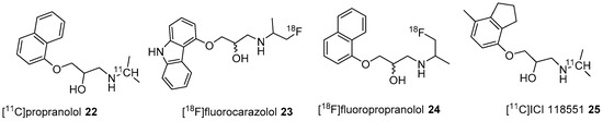 During the 1980s, propranolol, a β-blocker drug was labelled with C-11 (22, Figure 8) but was unsuitable as a PET ligand for β-ARs because of high nonspecific binding in vivo [109,110]. Subsequently, Berridge’s group described the synthesis of two isomers (R/S) of [18F]fluorocarazolol (23, Figure 8) through reductive amination using [18F]fluoroacetone and desisopropylcarazolol with 18.5–37 GBq/μmol molar activity [111,112]. The radiotracer 23 has subnanomolar Ki values for β-ARs (β1 0.4 nM, β2 0.1 nM) and Log P7.4 value of 2.19. The same group used S-23 for PET imaging of the pig heart and lungs to validate the β-AR biding. In 1997, Waarde et al., employed S-23 to image β-ARs in the human brain and obtained positive results [113]. They observed specific binding (blocked with pindolol) of S-23 in β-AR rich areas, striatum and various cortical areas. However, the radiotracer was discontinued for further human studies as fluorocarazolol was positive for the Ames test i.e., mutagenic [114].