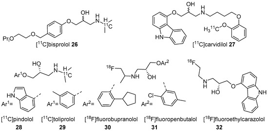 In 2002, Elsinga’s group reported five different potent and lipophilic β-AR antagonists (carvedilol, pindolol, toliprolol, bupranolol, and penbutolol) as PET probes to image β-ARs in rat brain [118]. C-11 labelled carvedilol (27, Figure 9; molar activity 12.97–25.9 GBq/μmol) was prepared through 11C-methylation using [11C]CH3I and its respective O-desmethyl precursor, whereas, [11C]pindolol (28, molar activity 25.9–37 GBq/μmol) and [11C]toliprolol (29, molar activity 22.2–25.9 GBq/μmol) were prepared via reductive amination using [11C]acetone and the respective desisopropyl precursors. The F-18 tracers of bupranolol (30, molar activity 11.1–18.5 GBq/μmol) and penbutolol (31, 22.2–99.9 GBq/μmol) were also prepared by means of reductive amination but using [18F]fluoroacetone and the respective des-fluoro-isopropyl precursors.