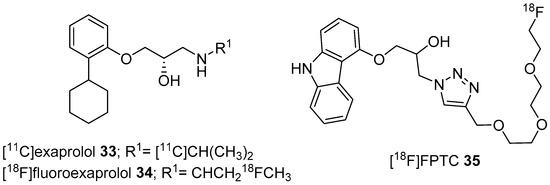 In 2008, Elsinga’s and Vasdev’s groups chose exaprolol (β-AR Kd = 9–9.5 nM) and developed S-[11C]exaprolol (33) and S-[18F]fluoroexaprolol (34), respectively, to image β-ARs with PET (Figure 10) [120,121]. Radiotracer 33 was prepared via reductive amination using [11C]acetone and desisopropylexaprolol precursor with >10 GBq/μmol molar activity and the radiotracer 34 was prepared through a nucleophilic substitution reaction using [18F]fluoride and a corresponding tosylate precursor followed by reductive hydrolysis, with 34.29 GBq/μmol molar activity. Regardless of good binding and kinetic properties, both these radiotracers showed high nonspecific uptake in the brain and were found to be inadequate for PET imaging of β-ARs.