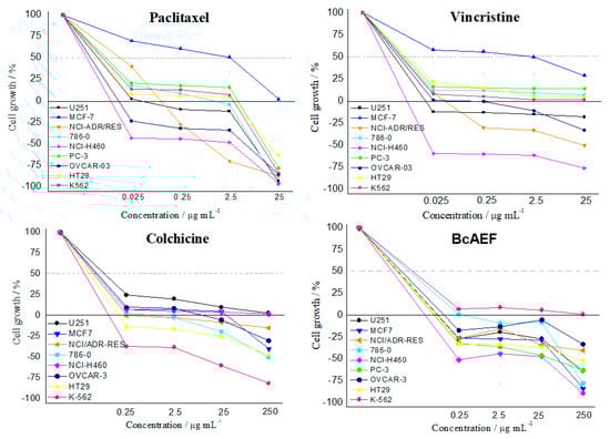 BcAEF was also tested in a higher concentration range (0.25 to 250 µg mL−1) together with paclitaxel (0.025 to 25 µg mL−1), vincristine (0.025 to 25 µg mL−1), and colchicine (0.25 to 250 µg mL−1) to observe and compare their antiproliferative profiles; the profiles were compared and resemble one another (Figure 1).