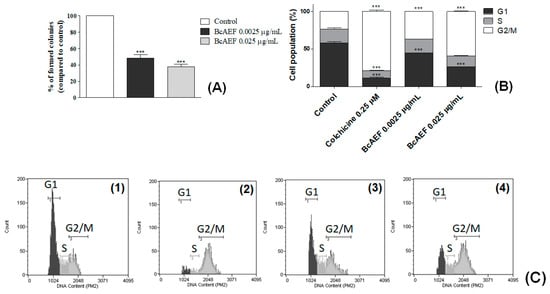 Inhibitory effects of BcAEF on NCI-H460 cell proliferation and cell cycle. (A) Percentage of colonies in the colony formation assay of untreated cells (control) and cells treated with 0.0025 and 0.025 µg mL−1 of BcAEF. (B) Influence on NCI-H460 cell cycle. NCI-H460 cells were treated for 30 h with 0.25 µM of colchicine (positive control), 0.0025 and 0.025 µg mL−1 of BcAEF. Statistical analysis: two-way ANOVA followed by Bonferroni test (*** p < 0.001, relative to untreated cells-control). (C) Histograms of cell cycle analysis (cell count vs. DNA content, Guava Cell Cycle module) of (1) untreated cells—control, (2) 0.25 µM of colchicine, (3) 0.0025 µg mL−1 and (4) 0.025 µg mL−1 of BcAEF over NCI-H460 cells (30 h), showing cell population in G1, S and G2/M phases.