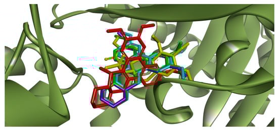Redocking of colchicine into the corresponding ligand site of β-tubulin using the GoldScore function resulted in a root mean square deviation (RMSD) = 0.44 Å, validating the docking parameters for the subsequent runs with the selected alkaloids. By analyzing the docking scores (Table S1), the affinity score was colchicine >> R-boehmeriasin A > (−)-C (15R)-hydroxycryptopleurine = R-boehmeriasin B > R-cryptopleurine. Superposition of colchicine and the other alkaloids is illustrated in Figure 3. The main intermolecular interactions performed by the selected alkaloids and colchicine with the amino acid residues from the colchicine biding site of β-tubulin are illustrated in Figures S4–S8 (Supplementary Material).