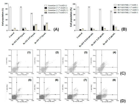 Programmed cell death effects of BcAEF on NCI-H460 cells. (A) Influence of BcAEF on phosphatidylserine externalization of NCI-H460 after 36 h of treatment. NCI-H460 cells were treated for 36 h with 0.025, 0.25 and 2.5 µg mL−1 of BcAEF. (B) Influence of BcAEF on caspases activation of NCI-H460 after 48 h of treatment. NCI-H460 cells were treated for 48 h with 0.025, 0.25 and 2.5 µg mL−1 of BcAEF. Statistical analysis for PS externalization and caspases activation: two-way ANOVA followed by Bonferroni test (** p < 0.01 and *** p < 0.001, relative to untreated cells - control). (C) Dot-plot graphics of cell distribution after using Annexin-V and 7-AAD dyes over NCI-H460 cells treated for 36 h (Guava Nexin Module): (1) untreated cells (control), (2) 0.025 µg mL−1, (3) 0.25 µg mL−1 and (4) 2.5 µg mL−1 of BcAEF. (D) Dot-plot graphics of cell distribution after using SR-VAD-FMK and 7-AAD dyes over NCI-H460 cells treated for 48 h (Guava MultiCaspase module): (5) untreated cells (control), (6) 0.025 µg mL−1, (7) 0.25 µg mL−1 and (8) 2.5 µg mL−1 of BcAEF.