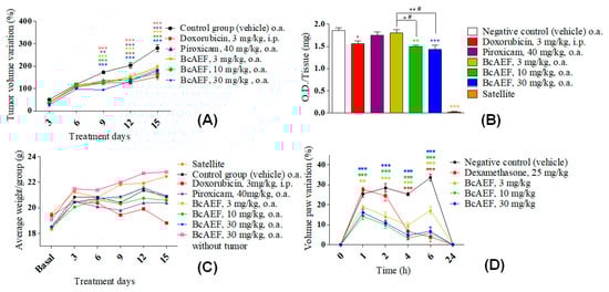 Antitumor and anti-inflammatory effects of BcAEF on Ehrlich solid tumor model and CG-induced paw edema model. (A) Mean tumor volume variation (%) in the Ehrlich solid tumor paw model during 15 days of treatment with vehicle (negative control), positive controls, and BcAEF. (B) Myeloperoxidase (MPO) activity expressed as O.D (optical density) per milligram of paw tissue with (vehicle group, positive controls and BcAEF) or without (satellite group) Ehrlich’s solid tumor. (C) Variation of mice body weight during 15 days of experiment of Ehrlich’s solid tumor in the paw. (D) CG-induced paw edema represented by edema variation (%). Results were expressed as mean ± standard error. Groups = vehicle (negative control), doxorubicin (positive control), piroxicam (positive control), BcAEF (3, 10, and 30 mg/kg), satellite (without inoculation of tumor cells and without treatment) and a group treated with the higher dose of BcAEF (30 mg/kg), in which tumor cells were not inoculated. Legend: i.p. intraperitoneal; o.a. oral administration. Statistical analysis: * p < 0.05, ** p < 0.01 and *** p < 0.001, statistically significant difference in relation to the vehicle group (two-way ANOVA followed by Bonferroni test).