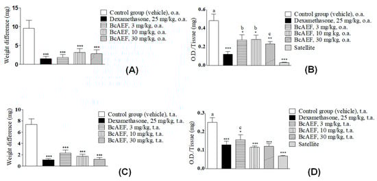 Anti-inflammatory effect of BcAEF evaluated on croton oil-induced ear edema. (A,C) Results are expressed as the mean ± standard error media; weight difference (mg) = weight differences of equal portions obtained from the treated and untreated ears of the animals from each experimental group. (B,D) Tissue sample evaluated: ear fragment after exposure to croton oil; myeloperoxidase activity expressed as O.D. (optical density) per ear milligram. Groups: negative control (vehicle = acetone 70% to group with application topic or 10 mL kg−1 of the PBS pH 7 + tween 80 5% to group with oral treatment), positive control (dexamethasone), and experimental group (BcAEF: alkaloid enriched fraction extracted from the aerial parts of Boehmeria caudata Sw). Legend: t.a. topic application; o.a. oral administration. Statistical analysis: * p < 0.05, ** p < 0.01 and *** p < 0.001, significant difference by statistical means according to vehicle group. a: p < 0.001, b: p < 0.01, c: p < 0.05, significant difference by statistical means according to satellite group (one-way ANOVA followed by Tukey test).