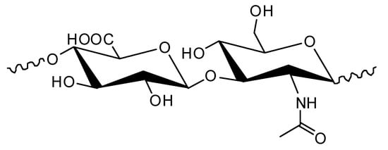 Hyaluronic acid (HA) belongs to the glycosaminoglycan compounds, which are members of the polysaccharides family. The molecule of HA is consisting of alternating units of N-acetyl-D-glucosamine and glucuronic acid. HA is a part of almost every tissue in vertebrates [1]. The molecular weight of HA is very high, up to several millions. The structure of HA is shown in Figure 1. HA is not covalently bonded to proteins, but it is widely distributed mainly in the connective tissue. Chemically, hyaluronic acid is a hydrophilic macromolecule with -COOH and -OH functional groups. The solubility of HA in water is high, and it forms highly viscous solutions. Such solutions show unique viscoelastic properties. HA can form intramolecular hydrogen bonding, which leads to three-dimensional structures. Hyaluronic acid can trap water within its structure and can form gels. The amount of trapped water is approximately 1000 times of the weight of HA. HA is a part of the following tissues: articular cartilage, the nucleus pulposus, skin, the cervix, and the glycocalyx of endothelial cells. The solutions and gels of HA are commonly used as a dermal filler. After injection, it is possible to restore skin volume and to minimize the appearance of wrinkles. HA is a very effective and safe ingredient of cosmetic formulation.