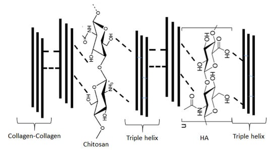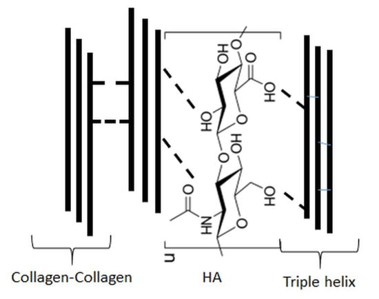 The investigation of the properties of the blends based on collagen and hyaluronic acid has been already initiated and several interesting biomaterials based on such blends have been proposed [22,23,24,25,26,27,28,29,30,31,32,33,34,35,36,37,38,39,40,41]. Several research groups have studied interactions between collagen and HA and the possibility of new materials formation based on such a blend. The possible interactions between collagen and hyaluronic acid are shown in Figure 2.