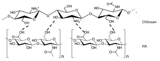 The degree of miscibility of chitosan with hyaluronic acid was analyzed by us by a viscometric method and atomic force microscopy [43]. The studies indicated that chitosan/hyaluronic acid blends were miscible at the weight fraction of chitosan w(Chitosan) ≥ 0.5 in 0.1 mol dm−3 CH3COOH/0.2 mol dm−3 NaCl and 0.1 mol dm−3 HCl at 25 degrees C. The influence of the type of solvent on the structure of chitosan, hyaluronic acid, and their blend films was investigated as well [44]. It was found that the surface roughness of chitosan, hyaluronic acid and their blended films was altered by mixing. The structure of chitosan blends with hyaluronic acid depends on the blend composition and on the solvent used for preparing the blend. Moreover, very important in miscibility were also the chitosan degree of acetylation and its molecular weight [45]. The possible interactions between chitosan and hyaluronic acid are shown in Figure 3. The interactions between hyaluronic acid and chitosan depend on pH and ionic strength [46]. Due to the strong charge complementarity between both of the biopolymers, electrostatic self-assembly may take place at very acidic pH but is almost unobservable at high ionic strength.