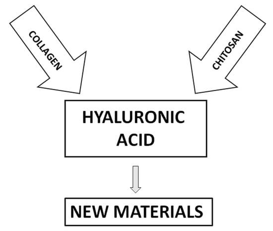 More than two polymers blending is a new trend in polymer science. In the most recently published literature, there are reports on ternary blends prepared using three different polymers. Although it is not easy to investigate the interactions between three different macromolecules, some attempts have been made to understand the chemical and physical forces acting on the molecular level. New materials based on ternary biopolymer blends have also been proposed. There are only a few papers in the scientific literature regarding hyaluronic acid blends with other natural polymers and synthetic polymers where interactions between biopolymers in mixtures have been scarcely described. Nevertheless, the interactions between collagen, hyaluronic acid, and chitosan in mixtures and materials based on collagen/hyaluronic acid/chitosan blend have been studied within the last 5 years [61,62,63,64,65,66,67,68,69,70,71,72,73,74,75,76] and new materials have been proposed.