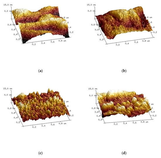AFM images of the surface of unmodified and samples modified with dialdehyde starch (DAS): (a) collagen, (b) collagen + DAS, (c) chitosan, (d) chitosan + DAS. [67], Copyright 2020. Reproduced with permission from Elsevier Ltd. (DAS = dialdehyde starch).