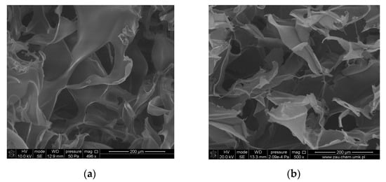 3D porous composites based on blends of chitosan, collagen, and hyaluronic acid were obtained through the lyophilization process, and the properties of the scaffolds were studied [68]. SEM images of such 3D composites are shown in Figure 7. Biological properties are also significant, especially for those materials that are dedicated to biomedical application. Natural polymers have been widely used in biomedicine and separately have been proposed as the in vitro extracellular matrix materials. However, the interactions of tricomponent–biopolymer composites with cells is not well studied yet. Biological properties of new materials obtained based on ternary blends should be investigated. For each blend, the proliferation rate of selected cells incubated with biomaterials should be studied. Hyaluronic acid addition to chitosan/collagen blend also modified the properties of 3D composites based on those biopolymers. The results showed that mechanical properties and thermal stability of chitosan/collagen blends were improved. Biological properties of 3D materials can be sufficient for biomedical applications, as it was found that materials were non-toxic and the cell morphology was not significantly altered [68].