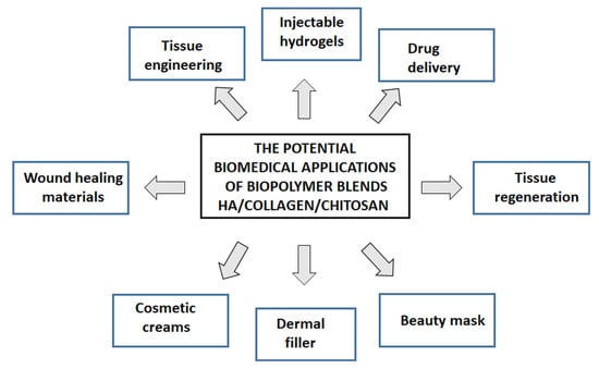 Potential applications of biopolymer blends base of HA, collagen, and chitosan.