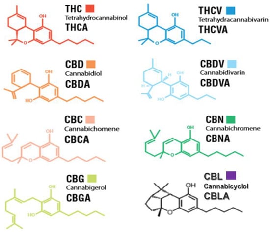 THC and CBD are at the center of others’ attention. It is a wonder why we have never heard too much of the other cannabinoids. Some of other well-known phytocannabinoids are shown in Figure 1, which may have possible medical effects including cannabinol (CBN), cannabigerol (CBG), cannabichromene (CBC), tetrahydrocannabivarin (THCV), cannabidivarin (CBDV), and cannabinodiol (CBND), cannabinidiol (CBDL), cannabielsoin (CBE), cannabitriol (CBT), cannabicyclol (CBL), and other minor compounds (Figure 1). Some of these cannabinoids such as THC, CBN, and CBDL are psychoactive, whereas CBD, CBC, and CBG are not [21,50,76,77,78].