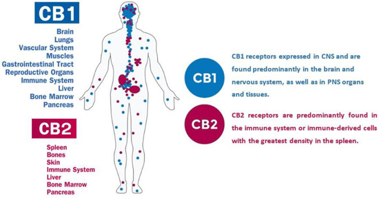 Phytocannabinoids (PCs) refer to those cannabinoid compounds synthesized in plants. There are two other different types of cannabinoids made in the mammalians called endocannabinoids (ECs), as well as synthetic cannabinoids (SCs) [82,83,84,85]. The ECs, mainly anandamide (AEA) and 2-arachidonoyl glycerol (2-AG), mediate their effects through two groups of receptors designated as cannabinoid-1 abbreviated as CB1 and cannabinoid-2 that is known as CB2 [64,86,87]. The ECs bind to CB1 and CB2 receptors with different levels of affinity. For instance, AEA has a high affinity for CB1, whereas 2-AG exhibits a higher affinity towards CB2 receptors [88]. They may also trigger multiple receptor-dependent and -independent mechanisms [81]. The CB1 receptors have been shown to be expressed in the central nervous system (CNS) and peripheral nervous system (PNS), presynaptic and axonal compartments, and also at lower levels in some extraneural tissues such as the testis, adrenal gland, bone marrow, heart, lung, prostate, thymus, tonsils, and spleen, as shown in Figure 2 [89,90,91]. They are found in particularly high levels in the neocortex, hippocampus, basal ganglia, amygdala, cerebellum, and brainstem [92,93,94]. The psycho-activity properties of cannabinoids appear to be related to these receptors. In contrast, CB2 receptors are primarily restricted to the PNS and mostly to the cells of the immune system with neuromodulatory functions (Figure 2) [89,90,95,96]. The mRNAs of CB2 receptors are abundant in spleen and tonsils and are found at levels equivalent to those for CB1 mRNA in the CNS [97,98].