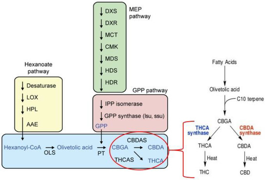 Cannabinoids are synthesized through either the polyketide pathway or deoxyxylulose phosphate/methylerythritol phosphate (DOXP/MEP) pathway which lead to the production of olivetolic acid (OLA) and geranyl diphosphate (GPP), respectively [109,110], and these biosynthetic pathways were well-reviewed in Flores-Sanchez and Verpoorte, 2008, Bakel et al., 2011 and Andre et al., 2016 (Figure 3). OLA production is catalyzed by polyketide synthase (PKS) and an olivetolic acid cyclase (OAC) [111]. The next stage giving rise to CBGA, the central precursor of Δ9- tetrahydrocannabinolic acid (Δ9-THCA), CBDA, and cannabichromenic acid (CBCA) includes alkylation of OLA with GPP which is catalyzed by geranylpyrophosphate:olivetolate geranyltransferase (GOT) (Fellermeier and Zenk, 1998). In the MEP pathway, however, the prenyl side-chain originates provide substrates for GPP synthesis which lead to the production of CBGA by an aromatic prenyltransferase (PT) [112]. The enzymatic reactions encompass THCA synthase (THCAS), CBDA synthase (CBDAS) and CBCA synthase (CBCAS) which convert CBGA to THCA, CBDA, and CBCA, respectively [113,114]. The last stage includes a nonenzymatic reaction during storage or smoking (heat) through decarboxylation of THCA and CBDA into THC and CBD (Figure 3) [108].