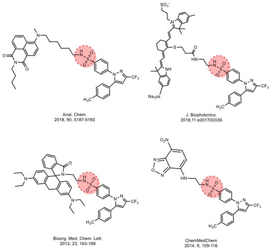 Based on the above observation, although many fluorescent probes targeting COX-2 have been developed [], inadequate targeting specificity limits their further clinical applications. As such the discovery of COX-2-specific cancer biomarkers is currently still in the early stages. After investigating structurally various celecoxib-derived COX-2 fluorescent probes, it appears to us that all were chemically modified in the position of N-atom in the sulfamide group [,,,] (Figure 1). Duo to the vital role of this group played in the binding to the COX-2 enzyme, as reported by Monahan [], we anticipated that if we tried to modify the celecoxib skeleton by migrating fluorophore moiety from the N position to pyrazole ring position as shown in Figure 1, it offered a high probability that a new structural space for obtaining more potent COX-2 probes may exist with potential of increased COX-2 targeting ability.