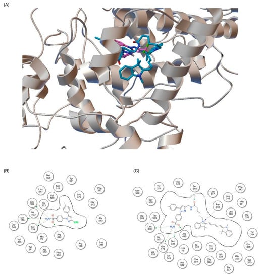 The binding modes of celecoxib and compound CCY-5 in COX-2. (A) 3D representation for both compounds, COX-2 binding study of celecoxib analogues. The binding modes of celecoxib (pink) and compound CCY-5 (green) at the active site of COX-2. (B) 2D diagram for celecoxib; (C) 2D diagram for CCY-5.