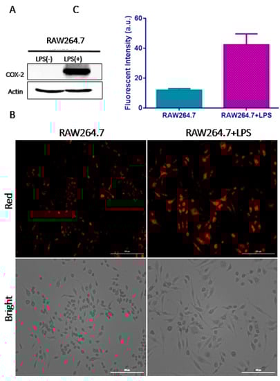 (A) Western blot showing COX-2 expression level of RAW 264.7 cells treated with lipopolysaccharide (LPS) (1 μg/mL), which induced the COX-2 expression level. (B) Fluorescent images of RAW 264.7 and inflamed RAW 264.7 cells. Fluorescence images of LPS-induced inflamed cell lines (RAW 264.7 cells). Cells were incubated with LPS (1 μg/mL) for 12 h, followed by CCY-5 treatment (1 μM) for 2 h (λex: 628 nm; Red, λem: 685 nm; All the images share the same scale bar: 200 µm). (C) Quantitative image analysis of the average total fluorescence intensity of RAW 264.7 cells (n = 3). * p < 0.05.