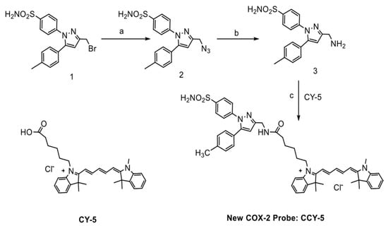 The synthesis of probe COX-2 probe (CCY-5). Reagents and reaction conditions: (a) DMF, NaN3, KI, (b) PPh3, H2O, THF, (c) EDCI, DMAP, DCM.