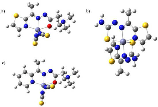 In order to calculate the ground-state geometries of the complexes, DFT calculations of [ZnL1(NCS)2] (1) and [Zn(L2)2] (2), as well as [ZnL3(NCS)2] (3) complexes have been performed, as described below. DFT calculations predict five-fold coordination for both [ZnL1(NCS)2] and [ZnL3(NCS)2] complexes with tridentate ligands HL1Cl and HL3Cl and two nitrogen atoms from thiocyanate ligands (Figure 3), thereby supporting the experimental X-ray diffraction (XRD) results. In complex 2 DFT results show that two tridentate ligand molecules L2 coordinate the Zn(II) ion through thiazole nitrogen, imine nitrogen and thiolate sulfur atoms, forming an octahedral complex with four fused five-membered chelate rings, in agreement with experimental data. Selected bond lengths and values of valence angles are summarized in Table S5. The calculated geometric parameters of mixed ligand complexes are compared with the X-ray diffraction structures and show good agreement.