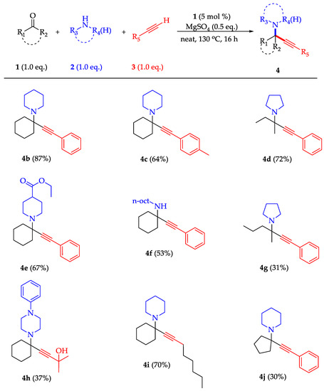 Several substrate combinations were coupled under the aforementioned conditions, as shown in Scheme 2. Piperidine led to compound 4b in high yield, as was the case in the parent, Zn-based, ligand-free system and the more recently reported Mn-based system [34,42]. Propargylamine 4c was obtained in moderate yield, while using a linear ketone in combination with pyrrolidine afforded compound 4d in 72% yield. Propargylamine 4e, bearing an ester moiety that can be used for further functionalization, was synthesized in good yield, while the primary amine-derived compound 4f was also successfully synthesized, albeit in moderate yield because of the stability of the intermediate imine. When the steric bulk of the linear ketone was increased, the yield dropped significantly, highlighting the crucial effect of steric hindrance in the outcome of this reaction (compound 4g). When an aliphatic alkyne was used in combination with N-phenylpiperazine, propargylamine 4h was obtained in 37% isolated yield. In order to assess the effect of a less functionalized aliphatic alkyne, 1-octyne was used and compound 4i was isolated in 70% yield. Finally, cyclopentanone was chosen as a coupling partner and, as anticipated based on known reactivity trends, compound 4j was obtained in moderate yield [34,42]. Overall, complex 1 allows for lower catalyst loading when compared to simple zinc salts and is more robust under harsh, ambient conditions [34]; however, the limitations of this coupling reaction and the generally observed trends regarding substrate scope persist in this case as well.