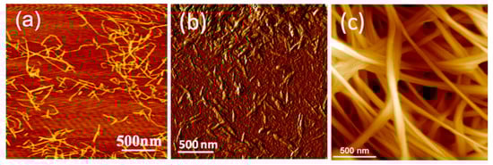 AFM images of (a) cellulose nanofibrils (CNF) [23], (b) cellulose nanocrystals (CNC) [24] and (c) bacterial cellulose (BC) [6].