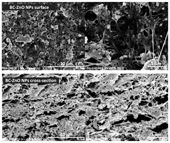 Field emission scanning electron microscopy (FE-SEM) images of surface and cross section of bacterial cellulose/zinc oxide (BC/ZnO) hybrids confirming ZnO nanoparticles (NPs) inclusion in the BC network [47].