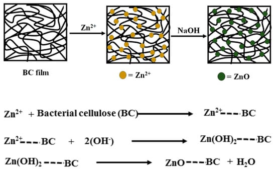 The mechanism proposed for the formation of ZnO NPs inside the BC network [59].