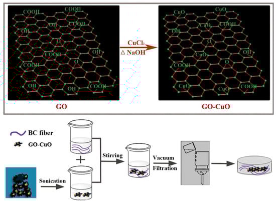 In a recent study by Xie et al. [13], BC/CuO hybrid films were prepared by incorporating the inorganic component into the BC matrix through homogenization blending. CuO nanosheets with variable lengths (50–200 nm) and widths (20–50 nm) were uniformly grown on graphene oxide (GO) platelets. Due to the various functional groups on its surface (e.g., hydroxyl, carboxyl, epoxide), GO provides nucleation sites for an efficient in situ growth of CuO nanostructures [81]. Moreover, GO can keep CuO NSs well dispersed in aqueous suspensions [82]. For the preparation of GO-CuO complexes, cupric chloride (CuCl2) was incorporated into an aqueous graphene oxide suspension by magnetic stirring at 100 °C for 60 min [13]. Afterwards, NaOH was slowly added for the conversion of the precursor into CuO nanosheets. The formed precipitate was separated by centrifugation, dried and ground to get GO-CuO powder. BC/GO-CuO nanomaterials were prepared by mixing aqueous suspensions of GO-CuO with BC slurries followed by drying using a sheet forming instrument (Figure 5). During the antibacterial assays performed on Staphylococcus aureus and Escherichia coli, it was observed that the BC/GO-CuO nanomaterials were more efficient against Gram-positive bacterial strains than that without GO. In addition, BC/GO-CuO hybrid films had better results in terms of microbial growth inhibition compared to BC/CuO films, thus indicating a synergistic bactericidal effect between GO and CuO. A possible mechanism of the antimicrobial action could be related to the direct contact of bacterial cells with the sharp GO-CuO nanostructures. The disruption of cellular membrane integrity caused by this interaction generates a surface collapse accompanied by cellular deformation and the increased production of ROS leads to bacterial cell death. The nanomaterials were non-cytotoxic against mouse embryonic fibroblasts cells (NIH-3T3), a slight increase of cellular viability (compared to the control group) being indicated by the MTT assay results for the group treated with BC films containing 10% GO-CuO. In virtue of their good biocompatibility and antimicrobial activity, the BC/CuO-GO films could represent a new generation of hybrid materials for applications in the biomedical field [13].
