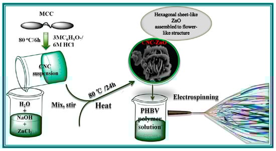 Owing to the electrostatic interactions between cellulose nanocrystals and zinc oxide, sheet-like CNC-ZnO nanohybrids were successfully developed by a one-step hydrothermal method [88]. CNCs were prepared by mixing microcrystalline cellulose (MCC) with an acid solution consisting of 90% citric acid and 10% HCl, at 80 °C for 6 h. The final CNC suspension (neutralized with NH4OH and washed with distilled water) was added in an aqueous solution of ZnCl2 containing NaOH as precipitating agent and homogenized at room temperature. The obtained CNC-ZnO nanohybrids were introduced into poly(3-hydroxybutyrate-co-3-hydroxyvalerate) (PHBV) using the electrospinning process (Figure 6).