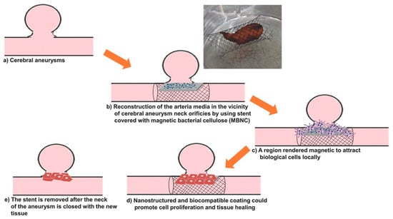 Cerebral aneurysms are the most critical events in cerebral trauma and surgical conventional treatments have low success rate [95]. Pavon et al. developed an alternative technique for neuro-endovascular reconstruction [95,96,97]. They used a co-precipitation-based method to functionalize bacterial cellulose hydrogel with Fe3O4 NPs. The materials were designed as coatings for the surface of metallic stents used for the reconstruction of tunica media tissue after a cerebral aneurysm. This novel process consists of arterial media reconstruction by using a stent covered with magnetic BC. Magnetic stimulation is used to orient magnetized endothelial cells, derived from the arterial wall or provided externally via a catheter, to the regions along the outer side of the BC/Fe3O4-covered stent. This method allows the growth of a new tissue over the device which closes the aneurysmal neck defect (Figure 7) [95]. Cellulose functionalization was performed by impregnating BC membranes with FeCl3·6H2O and FeCl2·4H2O solutions at 80 °C, under nitrogen flow and vigorous stirring accompanied by ammonium hydroxide (NH4OH) addition to form Fe3O4 NPs inside the BC [96]. The surface of magnetic NPs used to develop magnetic materials for tissue regeneration should be modified for increased biocompatibility because plain magnetic NPs could cause genotoxicity and cells necrosis [97]. Different solutions were tested for improving biocompatibility. In one attempt, oleic acid was added into the ferrofluid used for BC impregnation during the heating stage [97]. SEM images indicated that the magnetic NPs had an aggregation tendency, most likely due to the polar nature of fatty acid functional groups on their surface. In other attempts, polyethylene glycol (PEG), polyethyleneimine or citric acid were used to coat magnetic materials [95]. The nano-mechanical properties of neat BC and BC/Fe3O4 were evaluated using in situ nano-indentation measurements in hydrated state. The stiffness range of the BC/Fe3O4 hybrids (0.0025–0.04 GPa) was close to the values measured for both large arteries and veins of human cerebral vessels. A residual elastic straining effect similar to the one characteristic to biological tissues (e.g., tendons, blood vessels, ligaments) was also observed [97].