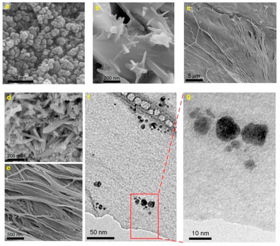 FE-SEM images of (a) Fe3O4 NPs, (b,c) CNC-PCA and (d,e) CNC-PCA/Fe3O4 hybrids, (f,g) TEM images of CNC-PCA/Fe3O4 hybrids [104].