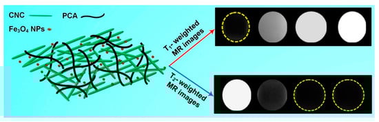 The XRD pattern of CNC-PCA/Fe3O4 showed all the diffraction peaks corresponding to the crystal planes of Fe3O4 and two new broad peaks at 2θ = 14.9° and 22.1° associated to (110) and (002) planes in the structure of cellulose. The high saturation magnetization value (52.2 emu·g−1) and good relaxivity parameters r1 (13.8 mM−1·s−1), r2 (96.2 mM−1·s−1), obtained at 3.0 T magnetic field strength, demonstrated that the hybrids could be used successfully as dual MRI contrast agents (Figure 9). In addition, a higher iron concentration was associated with an enhanced signal intensity of T1-weighted images (brighter images) and a reduced signal intensity on T2-weighted images (darker images), the contrast being improved in both cases. In vitro cellular uptake was performed using inductively coupled plasma optical emission spectroscopy and in vitro cytotoxicity to HeLa cell lines was also investigated. The results revealed an appropriate cellular uptake, excellent biocompatibility and low toxicity, characteristics which make the CNC-PCA/Fe3O4 nanohybrids promising for the intended biomedical application [104].