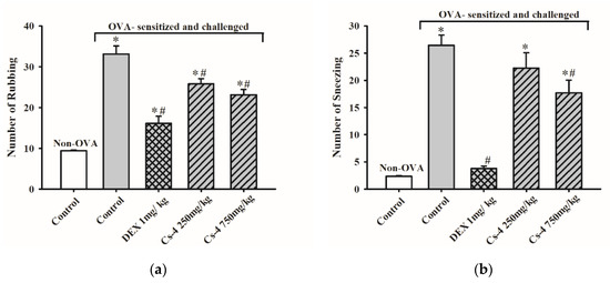 The effect of Cs-4 on the nasal symptoms of ovalbumin (OVA)-sensitized and challenged mice. Nasal symptoms of (a) nose rubbing and (b) sneezing were observed. Each bar represents the mean ± S.E.M., with n = 5. * Significantly different from the non-OVA control group. # Significantly different from the OVA-sensitized and challenged control group. DEX: dexamethasone.