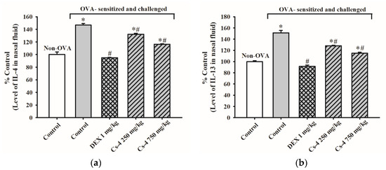 The effect of Cs-4 on (a) the levels of interleukin (IL)-4 and (b) IL-13 in the NLF of OVA-sensitized and challenged mice. Each bar represents the mean ± S.E.M., with n = 5. * Significantly different from the non-OVA control group. # Significantly different from the OVA-sensitized and challenged control group.