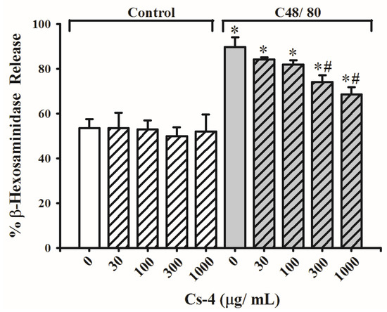 The effects of Cs-4 on the C48/80-activated β-hexosaminidase release in rat peritoneal mast cells (RPMC) in vitro. Each bar represents the mean ± SD, with n = 6. * Significantly different from the control group. # Significantly different from the C48/80 non-Cs-4-incubated control group.