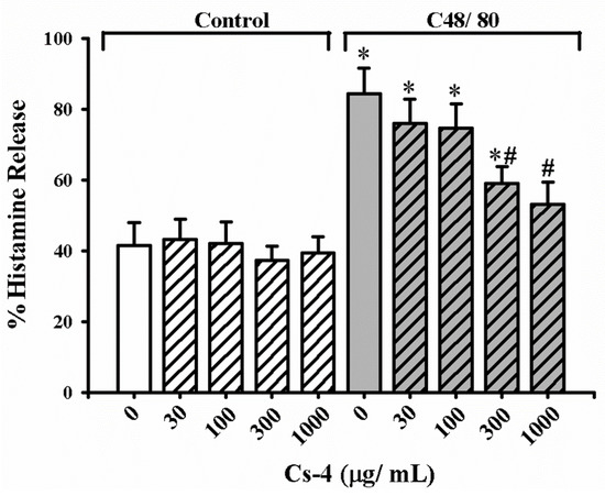 The effects of Cs-4 on the C48/80-activated histamine release in rat RPMC in vitro. Each bar represents the mean ± SD, with n = 6. * Significantly different from the control group. # Significantly different from the C48/80 non-Cs-4-incubated control group.